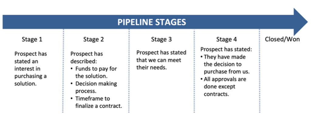 How do we do this? We create rules that are based upon the buyer’s demonstrated preference for our solution as measured by their words or actions. We refer to these as “Customer Verifiable Outcomes”. A good example is: “Buyer has stated they have selected our solution for purchase”. Note that the buyer is the subject of the sentence and the action they have taken to show increased commitment is that they have “stated they have selected our solution for purchase”. Now we see where the customer is in their “buying cycle” versus our “sales cycle”. We create rules for each pipeline stage that must be satisfied to move to the next pipeline stage. Here is a simplified example: